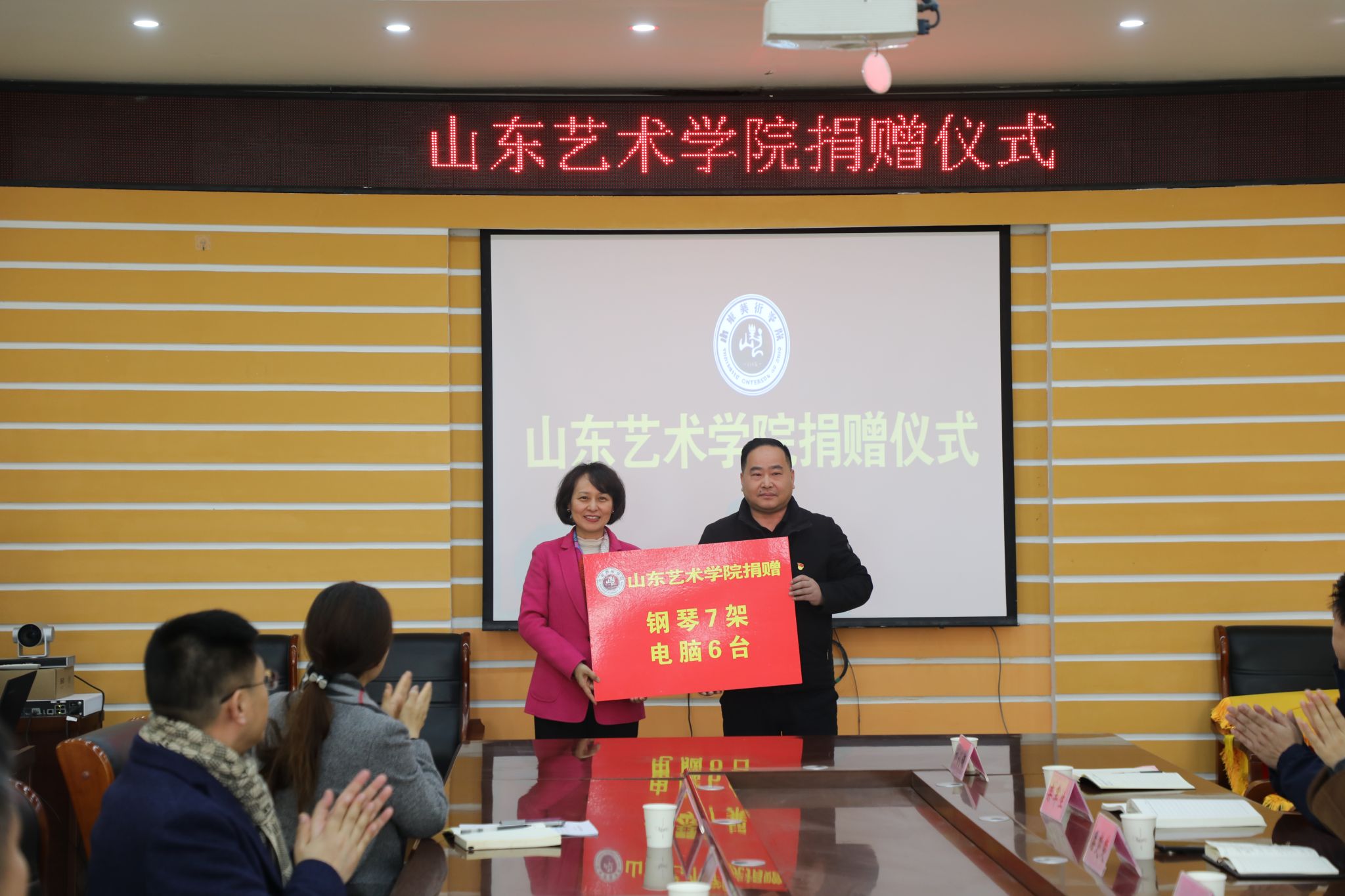 徐梅代表学校向都司镇中心小学捐赠钢琴、电脑等物资,并接受都司镇中心小学回赠的锦旗。她表示,学校愿意为乡村振兴和乡村教育尽绵薄之力,希望加深与乡村小学的合作交流,共同探索艺术教育和乡村教育的深度融合。
